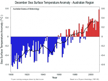 December sea surface temperature departures from average, from 1900 to 2010. Credit: Australian Bureau of Meteorology.