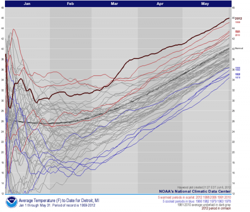 Haywood plot showing how temperatures in 2012 so far stack up against previous years for Detroit. Click on image for a Credit: NOAA/NCDC.