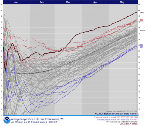 Haywood plot showing how temperatures in 2012 so far stack up against previous years for Milwaukee. Click on image for a Credit: NOAA/NCDC.