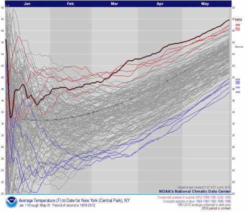 Haywood plot showing how temperatures in 2012 so far stack up against previous years for New York. Click on image for a Credit: NOAA/NCDC.
