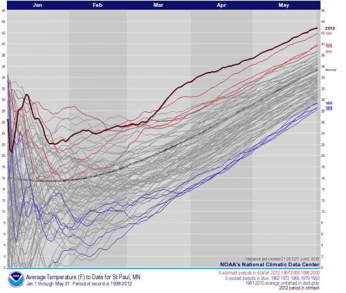 Haywood plot showing how temperatures in 2012 so far stack up against previous years for St. Paul, MN. Click on image for a Credit: NOAA/NCDC.