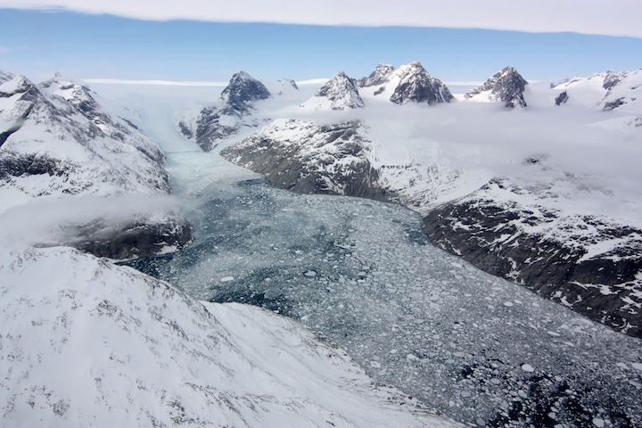 A fjord and glacier in southern Greenland captured on NASA IceBridge flight. The flights are part of a mission to monitor ice melt at both ends of the poles using low-flying planes.