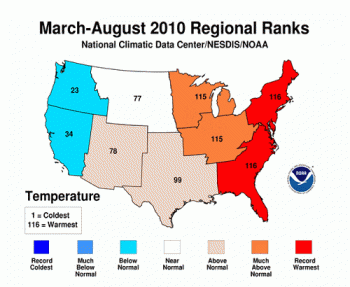 The March-August 2010 was the warmest such period on record in the Southeast. Studies show that by the end of the century, the number of hot days in the summer could double for this region. Credit: NOAA NCDC.