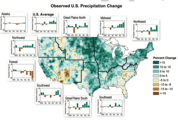 The report details precipitation changes across the U.S., and shows that while many regions are getting wetter in response to the warming climate, other areas are drying. In particular, the report shows that the Southwest, Southeast, and the Rocky Mountain states have seen precipitation decreases. These trends are exacerbating water supply concerns and increasing drought and wildfire risks as well.