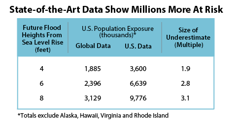 Columns show U.S. population estimated living on land 4-8 feet above local high tide line, depending upon data used. Under current emissions trends and medium sea level sensitivity to warming, chronic floods will reach by 2100 a global average of 5.5 feet above today's high tide lines.