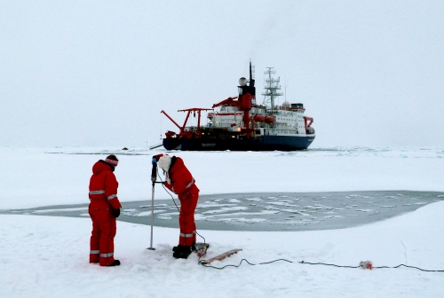 Researchers on the summer 2012 Polarstern cruise sample sea ice in the central Arctic.