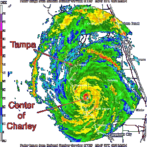 Click image to enlarge. Radar image of Hurricane Charley as it swept ashore south of Tampa in 2004. Credit: National Hurricane Center.