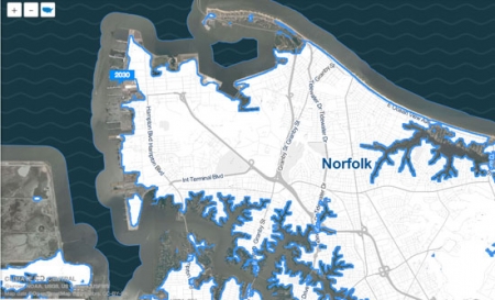 According to Climate Central’s research, Virginia’s Chesapeake area has one of the fastest rates of sea level rise in the country, due to a combination of manmade global warming and the natural sinking of land in this region.