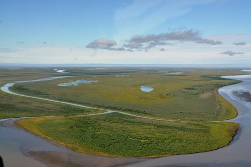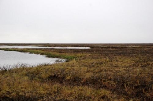 That event sent salty Beaufort Sea water churning across 47 square miles of coastal land. Its effects are still apparent today. Normally green delta land is covered with dead brown vegetation in areas inundated during that massive surge 14 years ago.