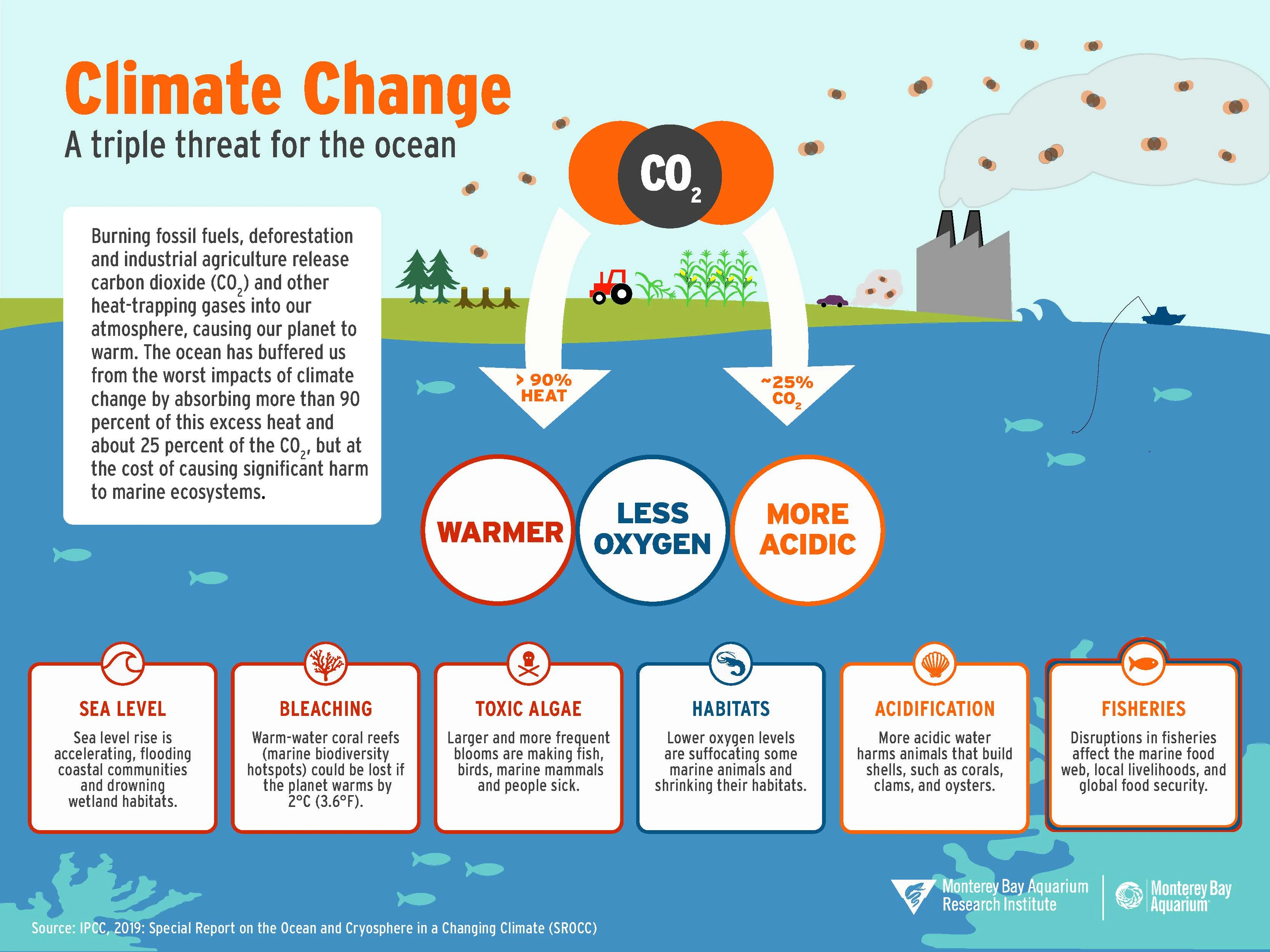 In recent decades, more than 90% of the excess heat and 25% of human-caused CO2 emissions have gone into the ocean. This has limited the severity of global warming on land, but with major consequences that affect humans and ecosystems alike. The warming waters are devastating coral reefs, and leading to oxygen depletion with dead zones that inhibit marine life. Dissolved CO2 also leads to an increase in ocean acidity, which has surged by 30% over the past 250 years—with significant impacts on many species. And rising sea levels are already an urgent concern, flooding coastal communities around the world. Drastically cutting our greenhouse gas emissions—as emphasized in last year’s IPCC report—would lessen these impacts.