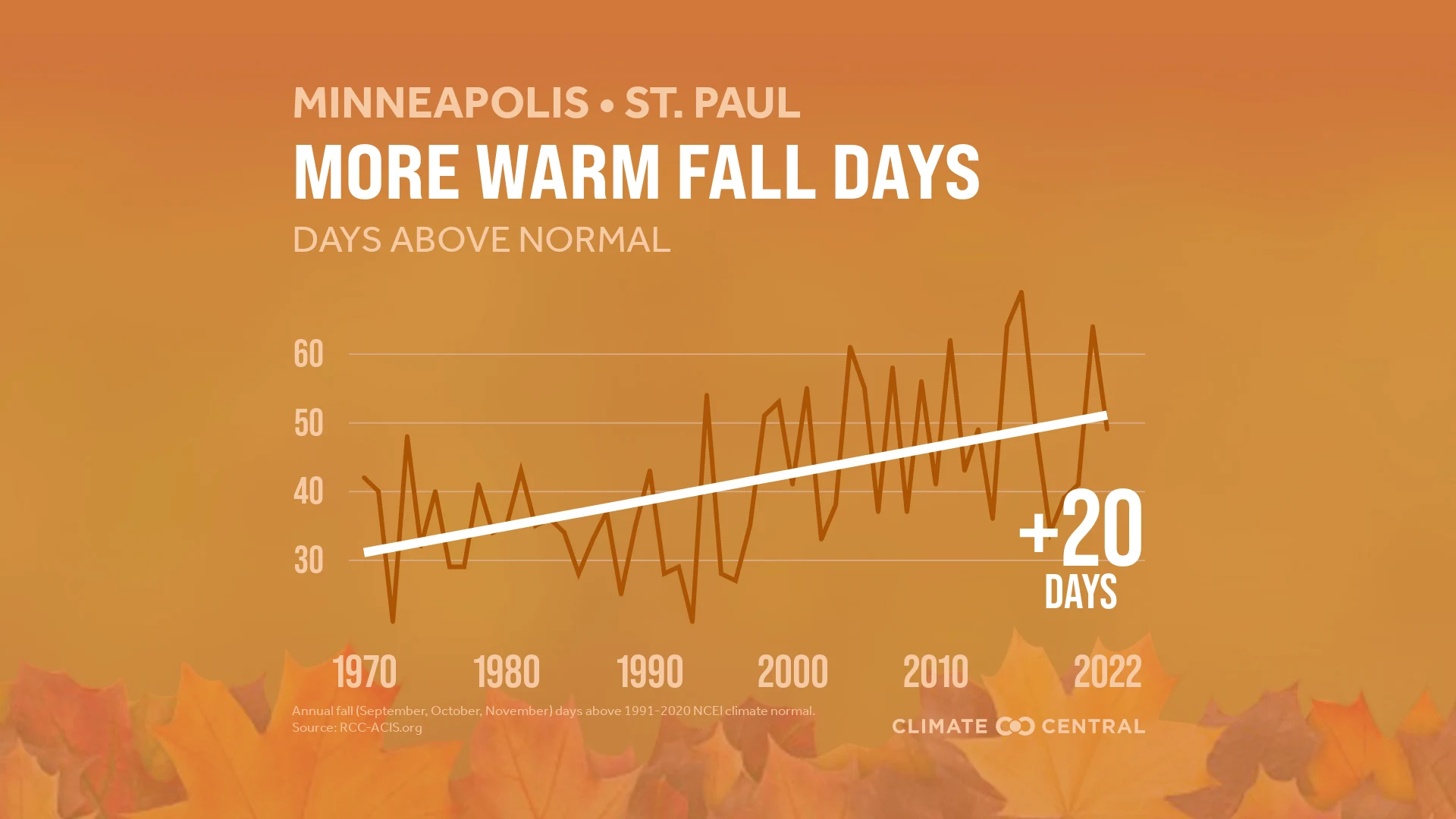 Fall (September, October, November) trends were calculated using data from the Applied Climate Information System from 1970-2022. Fall days above normal are relative to the 1991-2020 NCEI climate normal. Changes in average temperature since 1970 for U.S. climate divisions were calculated using data from NOAA/NCEI. Displayed trend lines on city analysis are based on a mathematical linear regression. Climate Central’s analyses include 247 cities, however, only 241 stations are included in reporting due to large data gaps in Dothan, Ala.; Hattiesburg, Miss.; Hazard, Ky.; Terre Haute, Ind.; Twin Falls, Idaho; and Wheeling, W.Va.