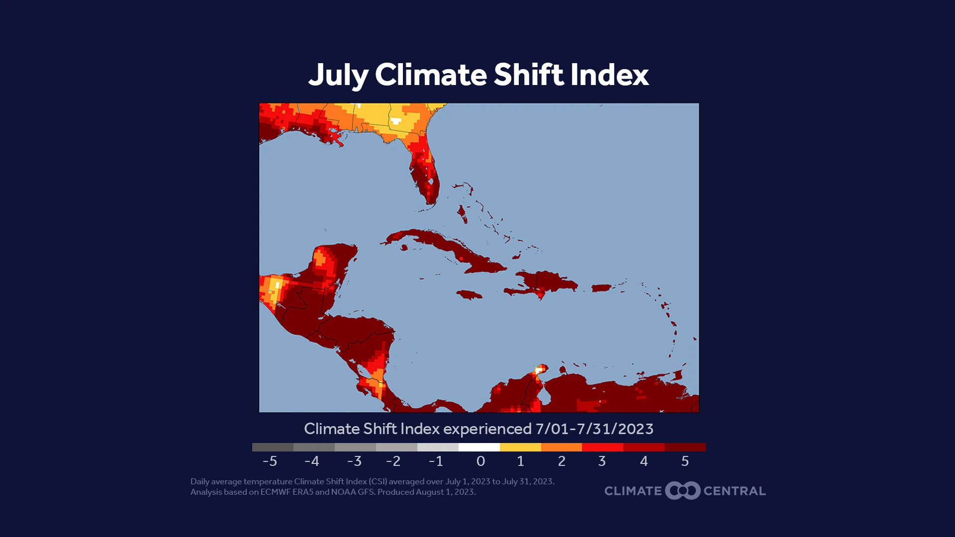 July average CSI levels were extremely high across Mexico, Central America, and the Caribbean. States and countries around the Caribbean Sea and Gulf of Mexico had exceptionally strong climate fingerprints in July. This includes Florida, Louisiana, Puerto Rico, Cuba, Guatemala, and Mexico, as well as many Caribbean islands.