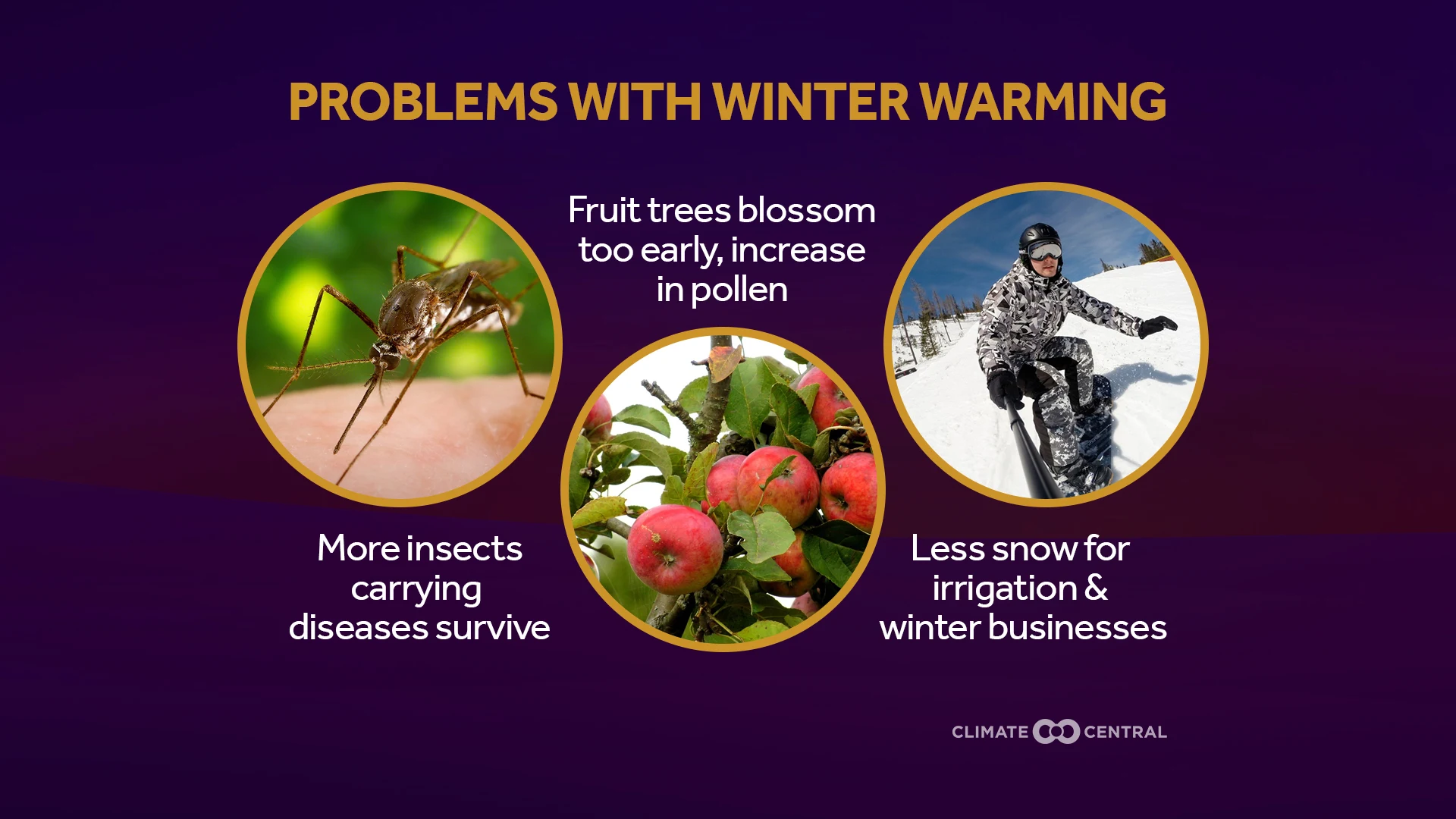 The decrease in winter cold effectively makes the winter shorter. While that might sound good at first, it comes with consequences for recreation, farming, and the environment. In colder climates, winter-based recreational activities, like skiing, ice fishing, and snowmobiling will become less prevalent. More disease-carrying insects, like mosquitoes and ticks, will survive through a milder winter. Declining snow pack leads to lower reservoir levels, providing less water for irrigation of crops. Fruit trees, which need to become dormant in the winter to blossom in the spring, may produce smaller yields. Pollen counts will rise, which can trigger respiratory illnesses for allergy sufferers.
