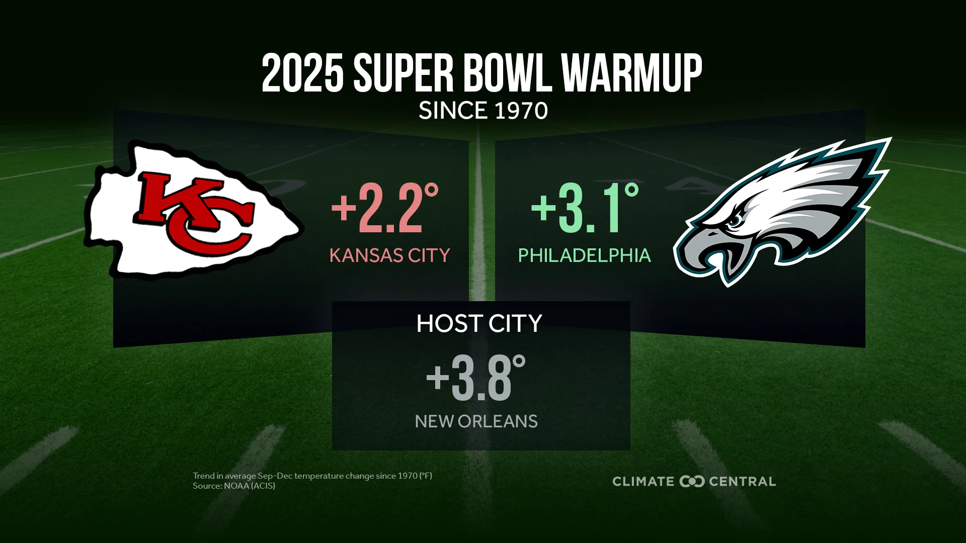 In a matchup of the 2025 Super Bowl teams, the Philadelphia Eagles have experienced 3.1°F of warming compared to 2.2°F for the Kansas City Chiefs.