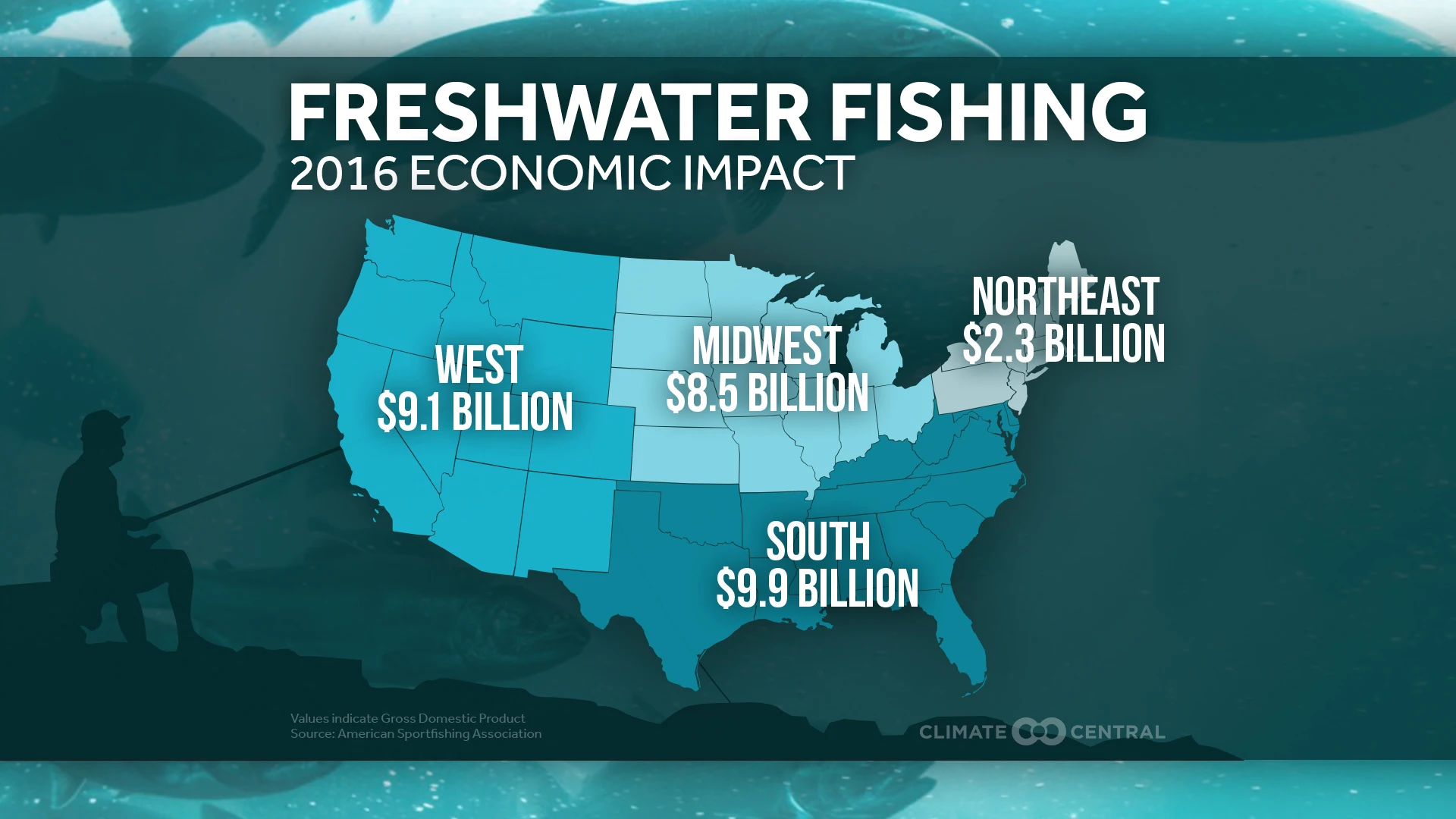 Each year, more than 49 million Americans fish recreationally in freshwater rivers and lakes. Some fish to relax, and some for the thrill. But in a changing climate, a new generation of anglers will have to get used to conditions far different from those of their parents and grandparents. Warming water in streams, rivers, and lakes is changing the habitats and behavior of fish, and resulting in a wide range of impacts in different parts of the U.S.