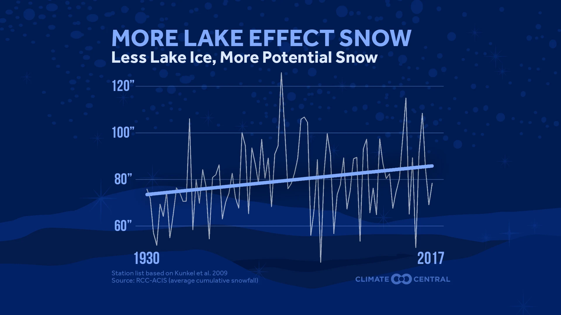 Lake effect snow will still occur in a warming world, but by the late 21st century, we can expect a shortened lake effect snow season. Rather than peaking in fall and early winter, heavy lake effect snow would be pushed back later in the season, generally from January through March.