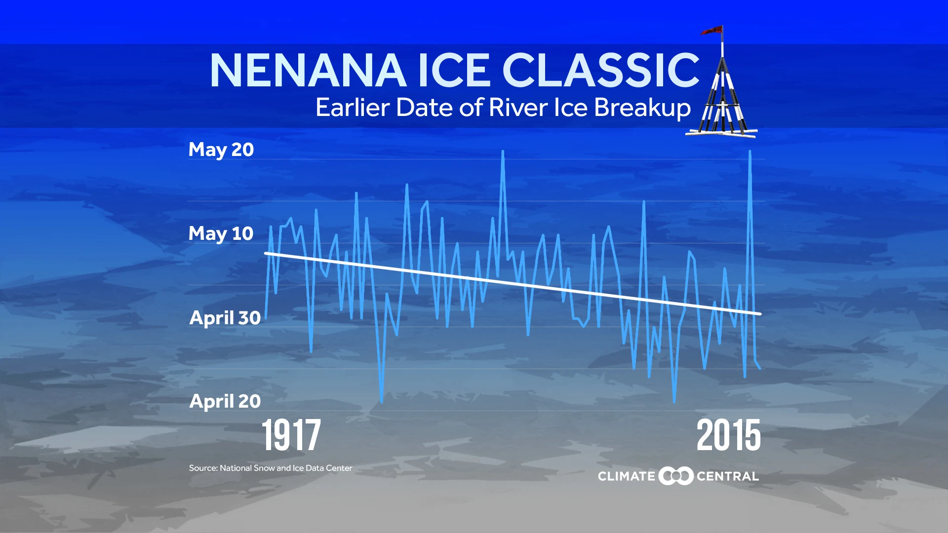 Because the ice breakup records go back to 1917, they also serve as a good climate indicator. During the contest’s history, the ice has broken as early as April 20 and as late as May 20, with an average breakup date of May 5. Of the 8 earliest ice breakups, 7 have come since 1990. Alaska just had its second-warmest winter on record, and its warmest January through March on record. This makes an early breakup date likely in 2016.