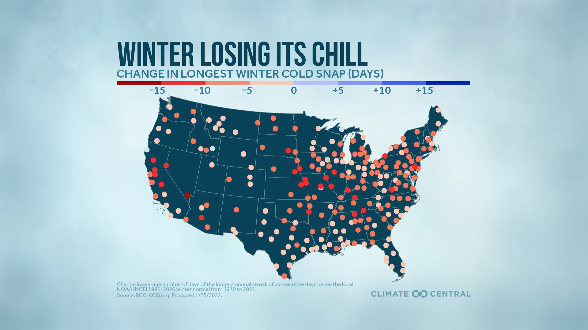 Cold snaps shrunk by 6 days on average across all 244 stations since 1970.