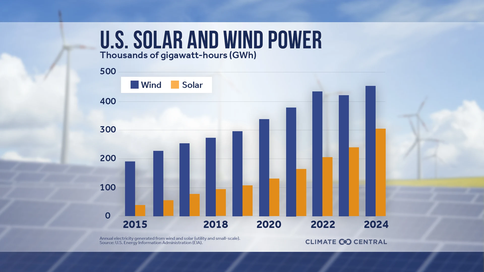 In 2024 the U.S. generated more electricity from solar and wind than ever before: a total of 756,621 GWh. Of this total, 40% (303,167 GWh) came from solar and 60% (453,454 GWh) came from wind.