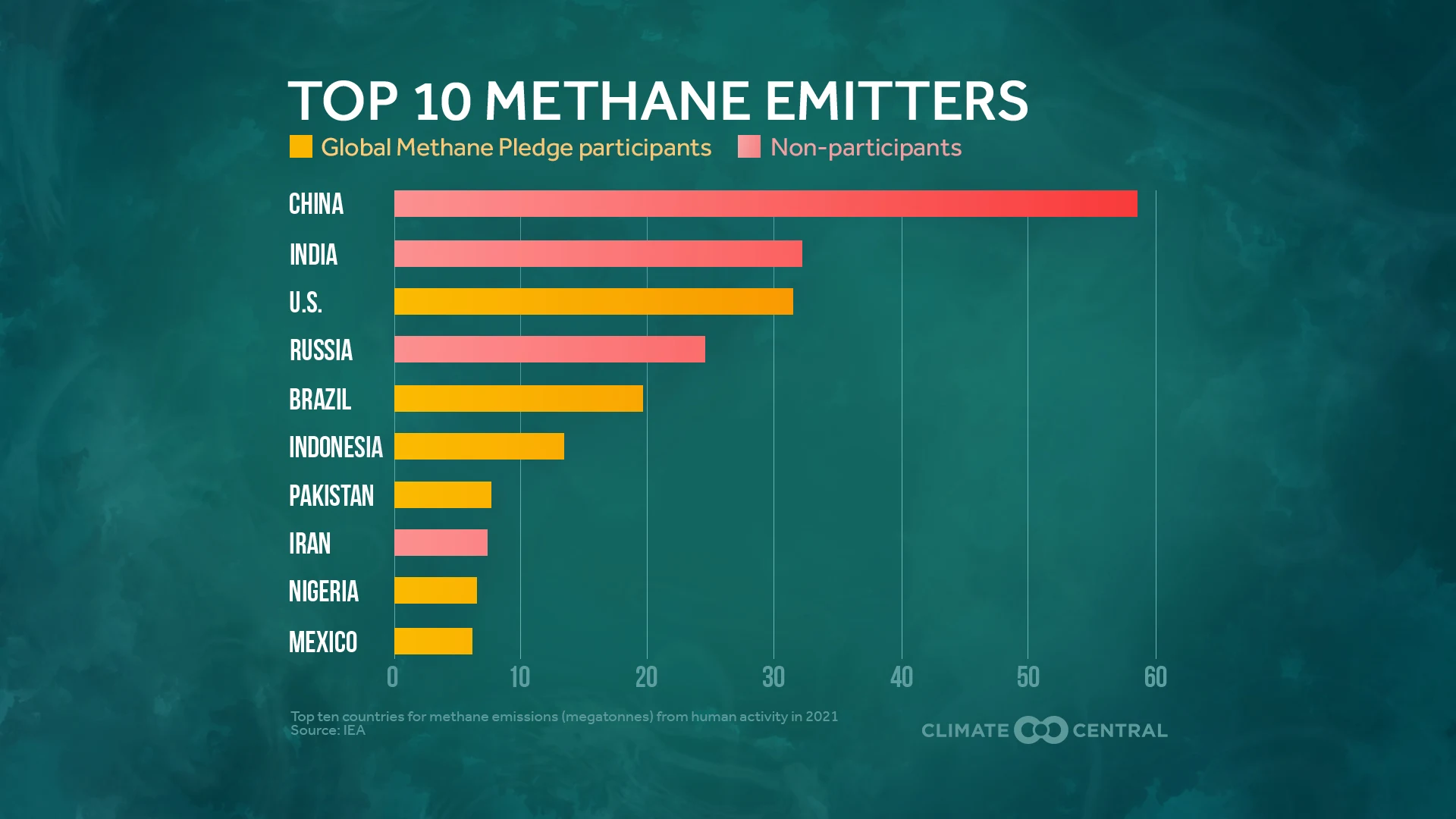 In 2021, COP26 launched the Global Methane Pledge–an agreement in which 125 nations committed to voluntary actions to reduce global methane emissions at least 30% from 2020 levels across all sectors by 2030. A year later, going into COP27, half of the top emitting countries (including China, Russia, and India) are not yet Pledge participants.
