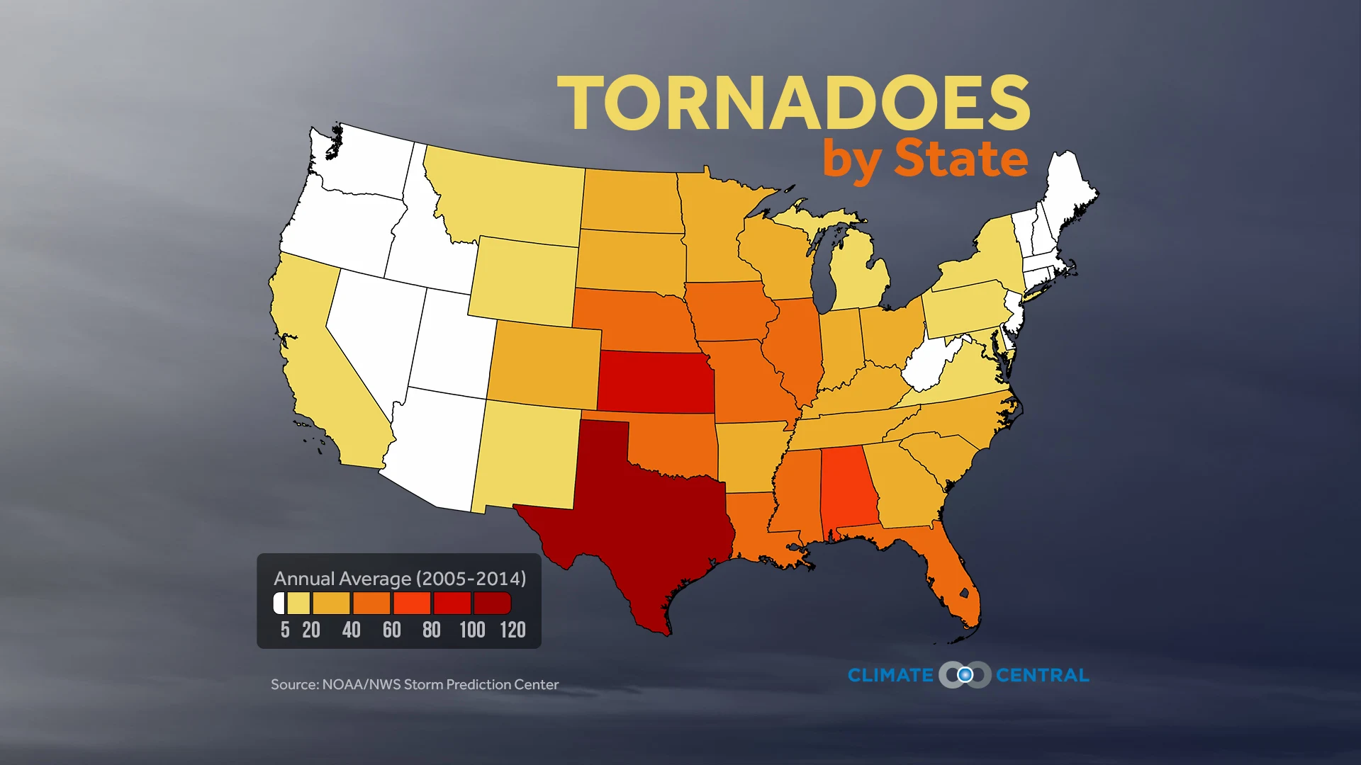To look for individual state trends, Climate Central compared the average number of tornado days in each state from the first decade of the analysis to the last decade. The core of Tornado Alley (KS, NE, OK, TX) has seen the average number of days more than one EF1+ tornado drop more than 50% during that 50 year timespan.