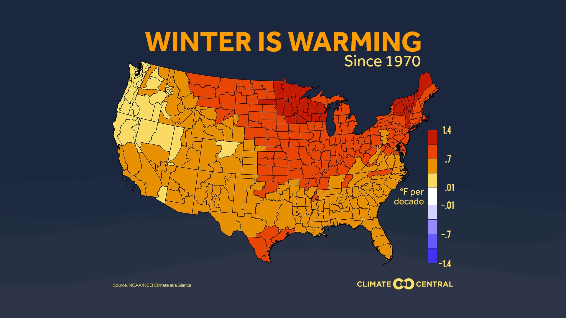 In parts of Minnesota, Wisconsin, and northern New England winters have warmed at an average rate of more than 1°F per decade since 1970 — that’s more than 4°F total. The five locations with winter average temperatures warming the most are: