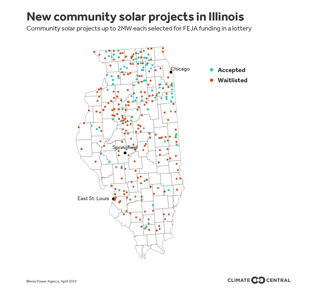 Map showing community solar projects chosen in a lottery and announced in April by the Illinois Power Agency. Accepted projects are shown with blue dots and waitlisted projects with red ones. Some projects may have since dropped out, allowing wait-listed projects to advance. Most community solar projects are at or near the 2 megawatt limit.