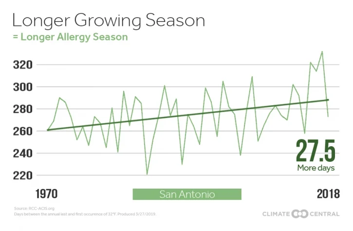 Temperature data analyzed by Climate Central shows San Antonio’s growing season has increased by nearly four weeks since 1970 — one of the biggest jumps nationwide. With worse ahead, doctors who treat allergy patients in San Antonio, long a pollen epicenter, say they’ve already noticed the problem intensifying.