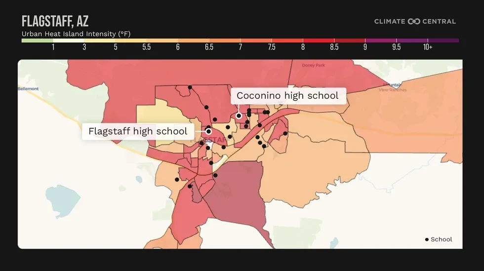 Climate Central modeled the warming influence of urban development across Flagstaff. Both Coconino High and Flagstaff High are in areas with elevated temperatures, increasing air conditioning needs at those schools. Provided By Climate Central