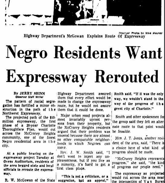 A 1962 Charlotte Observer news article covered residential outcry against the Northwest Expressway, which the city proposed would run right through McCrorey Heights, a predominantly Black neighborhood. Construction plans required a row of homes to be torn down. When the expressway went up in 1966, it displaced more than 240 families.