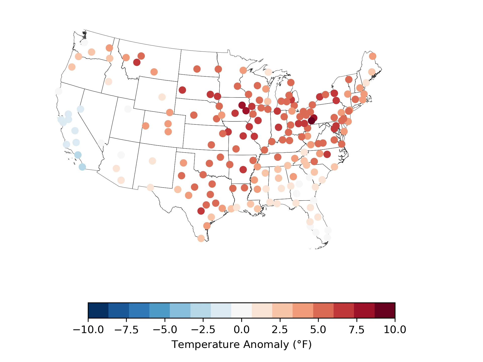 80 cities had temperature anomalies greater than 5°F. These included eight in Texas and six in Ohio.