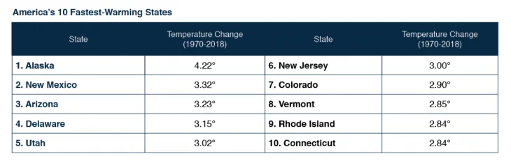 As for states, temperatures have risen at least 1.8oF in all U.S. states measured, with a national average increase of 2.5oF. While Alaska and some Western states have led the way, the Southern United States has seen far less temperature change. The Arctic is heating up about twice as fast as the rest of the world; in Alaska, average temperatures have increased by 4.2°F since 1970. Temperatures in New Mexico, New Jersey, Delaware, Arizona, and Utah have risen by at least 3°F since 1970.