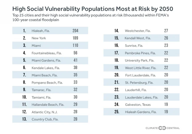 Finally, we also ranked coastal cities by their “high social vulnerability” population within the areas delineated by our second analysis. High social vulnerability was determined using the Social Vulnerability Index developed by the Hazards and Vulnerability Research Institute, which incorporates 29 different socioeconomic variables to evaluate the ability of communities to prepare and respond to environmental hazards such as floods. New York City, Philadelphia, Houston, Baltimore, and Miami were ranked as the top five cities with the largest high social vulnerability populations within the future FEMA 100-year floodplain — and thus face a difficult double jeopardy over time.