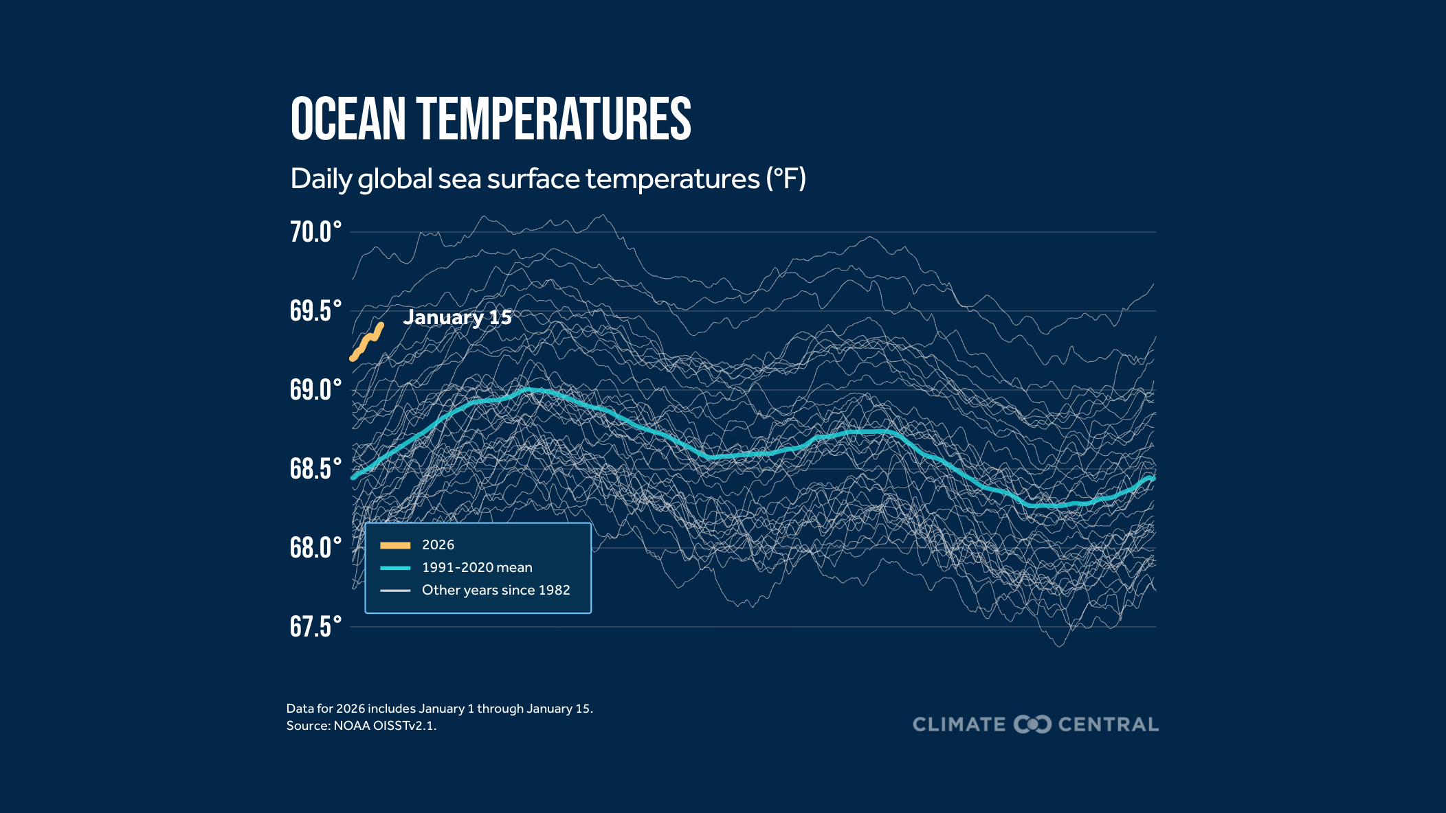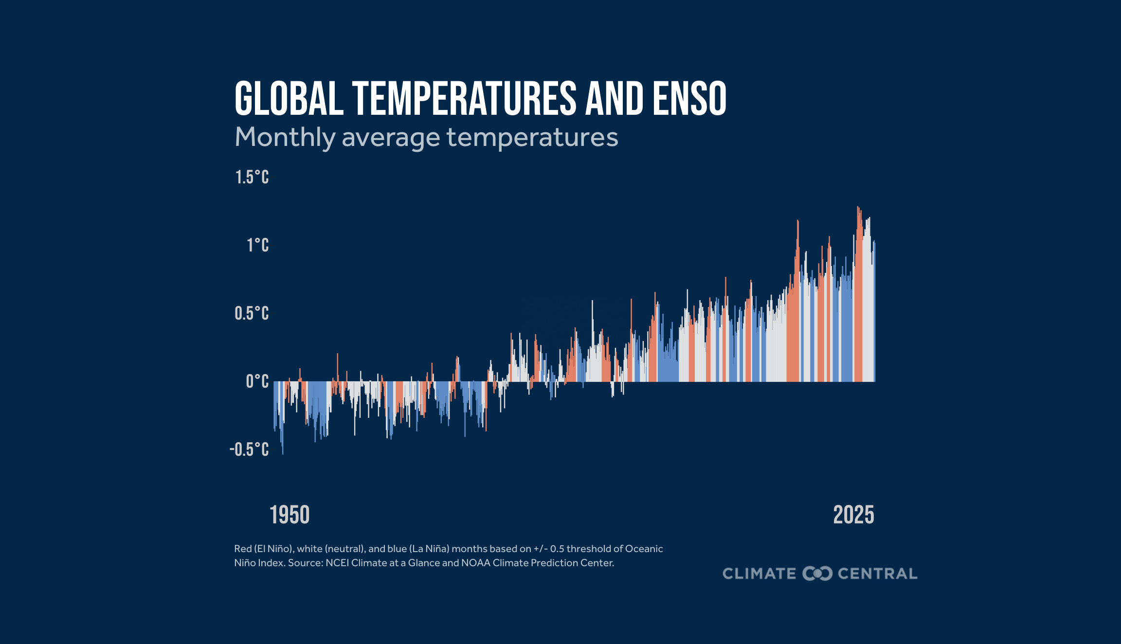 To account for this short-term variability, climate scientists use a range of methods to disentangle the human-caused climate change signal from long-term warming. At Climate Central, we have adopted a simple approach used by the Copernicus Climate Change Service (C3S) that averages global temperatures over successive 60-month periods (i.e., a centered running mean). This helps reduce the influence of natural variability, such as impacts from volcanoes and ENSO, although some decadal variability can still remain (for example, ocean temperature patterns like the Pacific Decadal Oscillation). As a result, we can more clearly see that while global temperatures are sharply rising, long-term human-induced warming is estimated to be 1.2°C to 1.4°C (2.2°F to 2.5°F) above pre-industrial levels. However, the 2025 U.N. Emissions Gap Report shows there is still a long way to go to stay below the risk-reducing Paris Agreement targets of 1.5°C and 2°C in the coming decades.