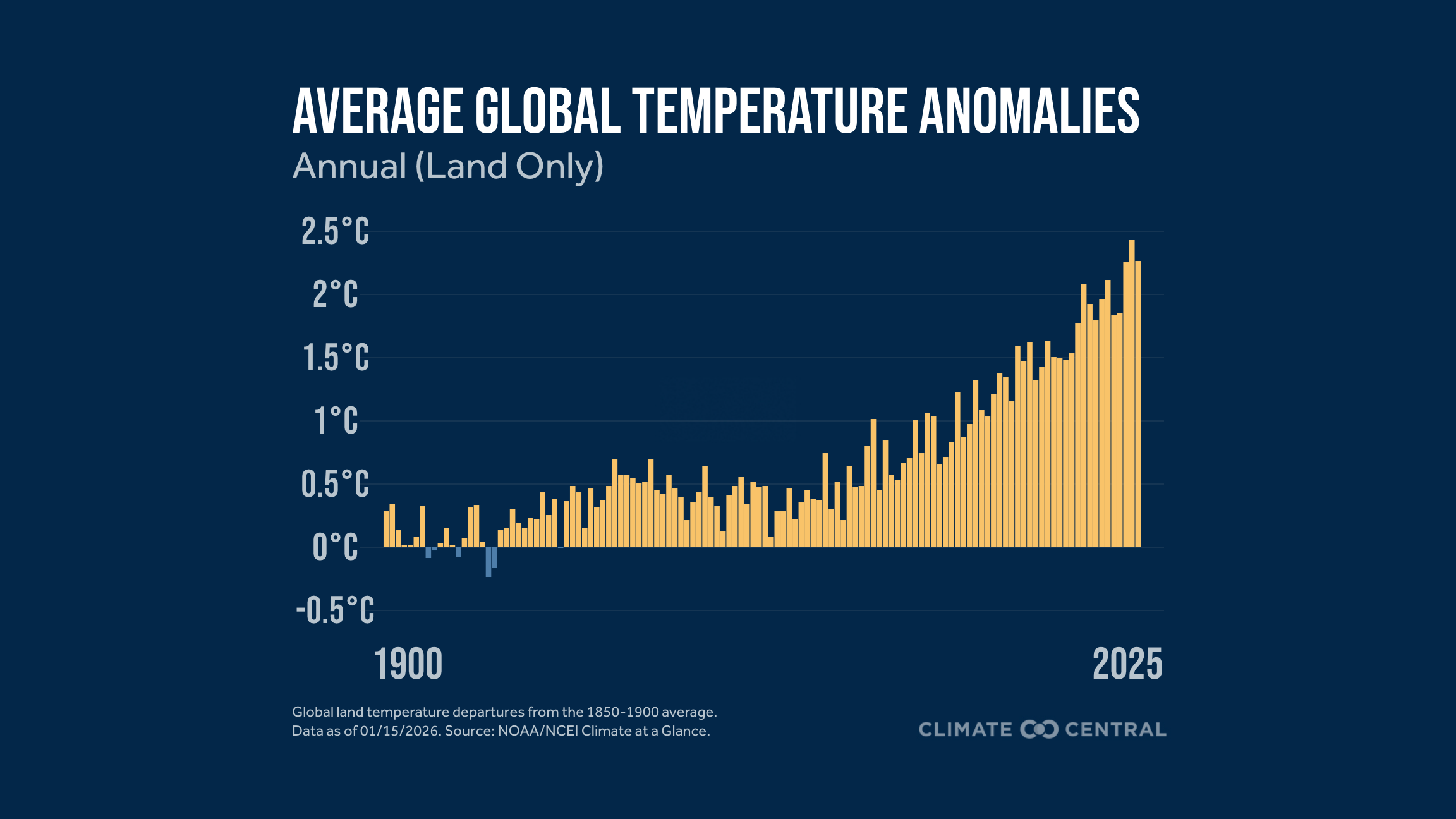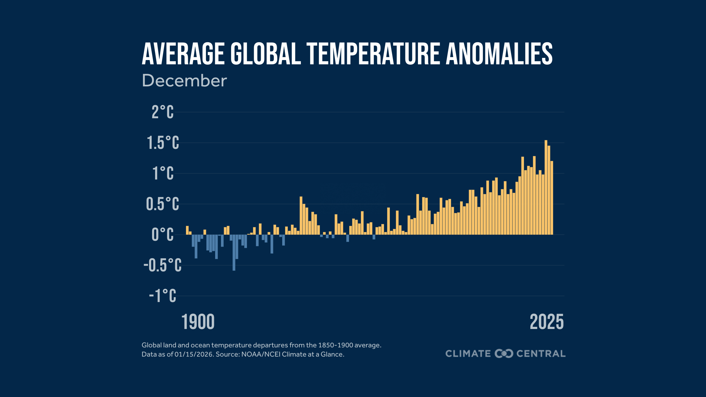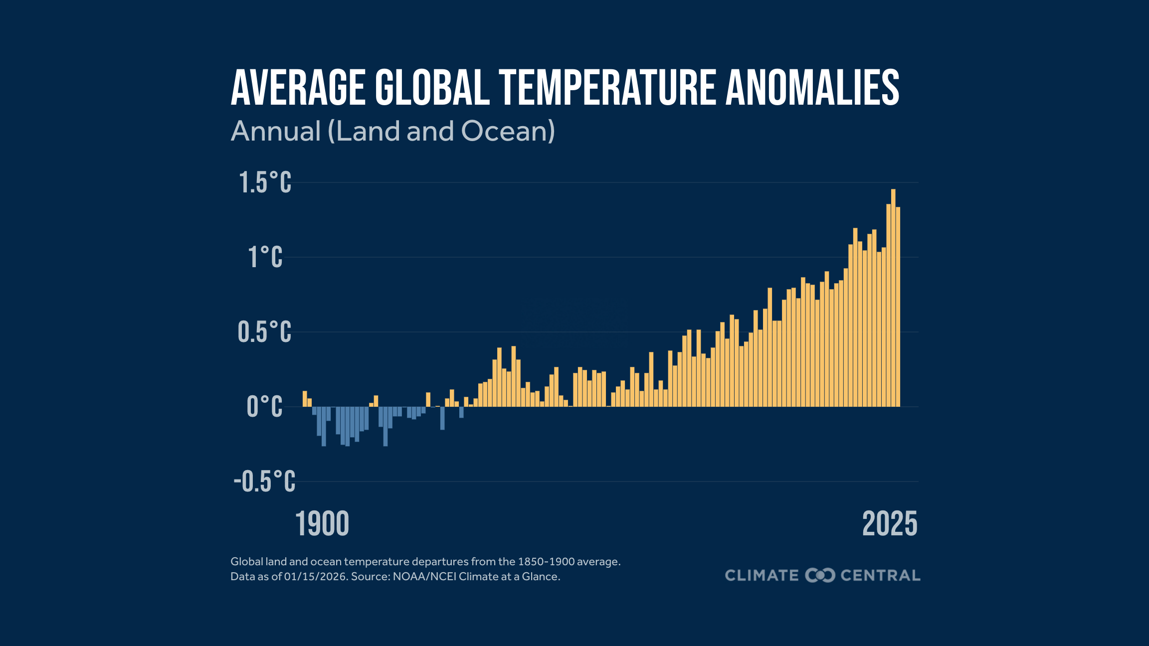 Depending on the dataset, several months and even some individual years have now reached 1.5°C (2.7°F) above pre-industrial levels. According to NOAA data, 2025 was approximately 1.3°C (2.4°F) warmer than the pre-industrial average. However, the climate system has substantial natural variability, especially from year to year, due to natural phenomena such as El Niño events that can temporarily boost global warmth. This means that a single month or even a single year at or above 1.5°C (2.7°F) does not necessarily mean that the long-term average global temperature change has exceeded the 1.5°C (2.7°F) threshold.