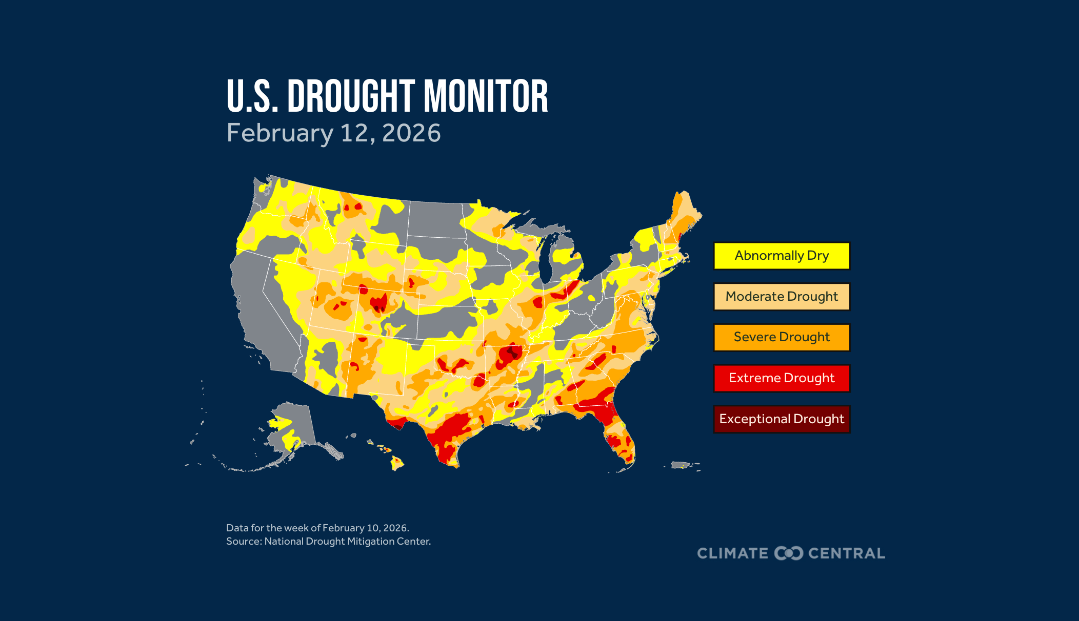 As of Feb 10, 2026, at least 72% of the contiguous U.S. is experiencing abnormally dry or drought conditions.