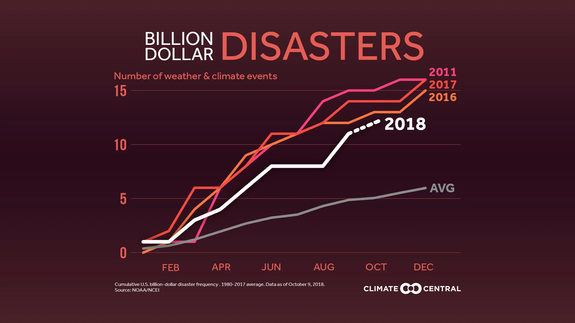 NOAA NCEI reported 11 weather and climate disasters with over $1 billion in damages through September (they report quarterly). When the final 2018 numbers are released in January, Hurricane Michael will be added as the 12th and other events could exceed the billion-dollar threshold. November’s individual wildfires will not count separately; according to NOAA lead analyst Adam Smith, “our analysis treats U.S. billion-dollar wildfire and drought events as regional-scale, seasonal events, not as multiple isolated events. Therefore, this year's Western wildfire analysis will again be treated as one event." However, the cost of each fire will certainly be counted. Last year’s wildfires tripled the previous cost record, and this year’s total could eclipse the new record of $18 billion.