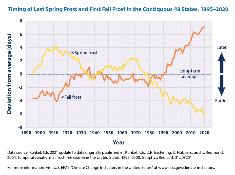 Longer annual growing seasons and pollen seasons are due both to: earlier spring warm-up (last spring frost happens earlier) and later fall cool-down (first fall frost happens later).