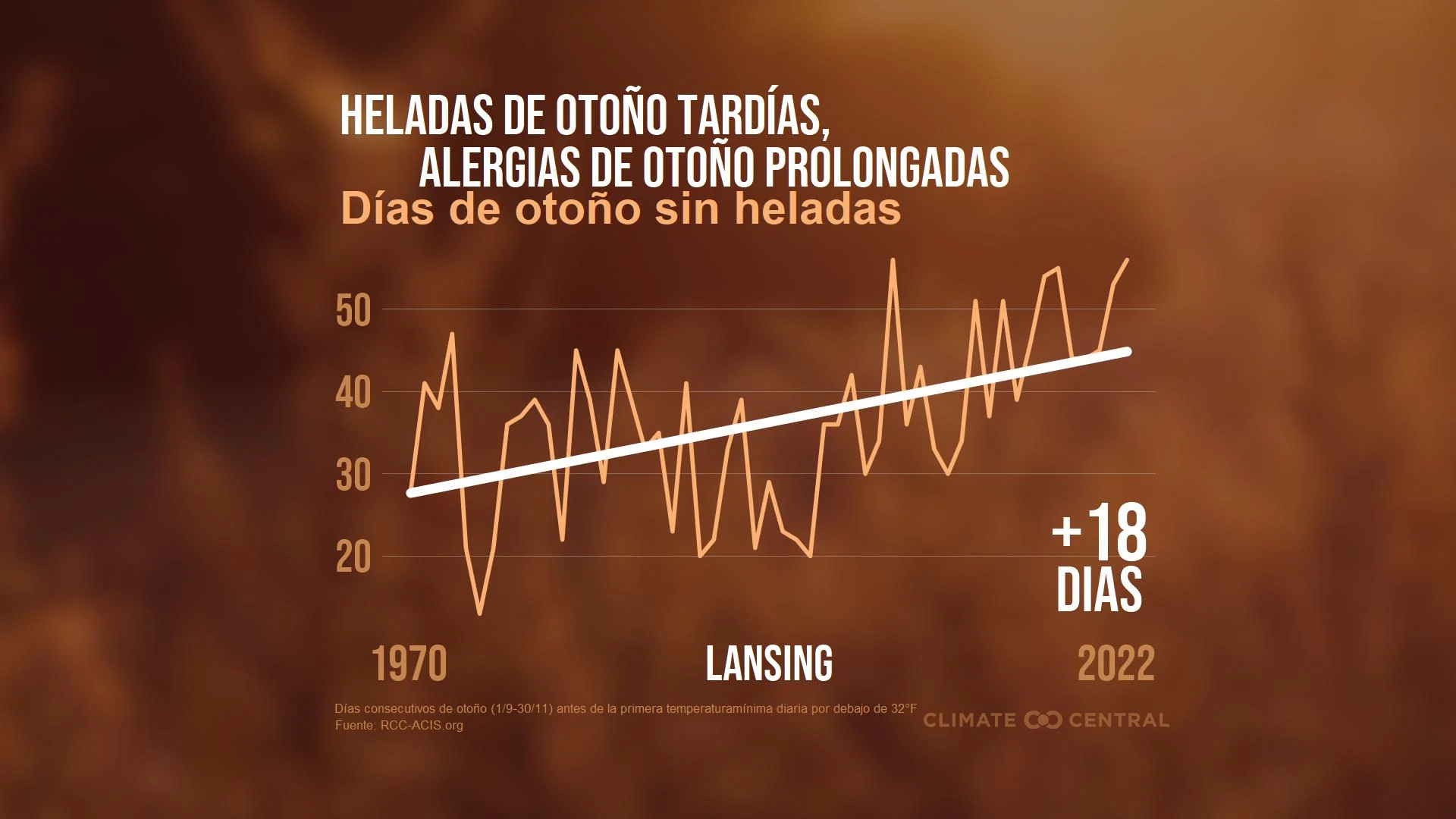 A medida que el calor del verano se extiende hasta el otoño, también lo hace la temporada de crecimiento. Esto puede beneficiar a algunos cultivos agrícolas, pero también puede provocar estrés hídrico y una temporada de alergias más larga y tardía. Una temporada de crecimiento más larga para la ambrosía y otros alérgenos otoñales afecta a millones de personas en los EE. UU. que sufren de alergias estacionales.