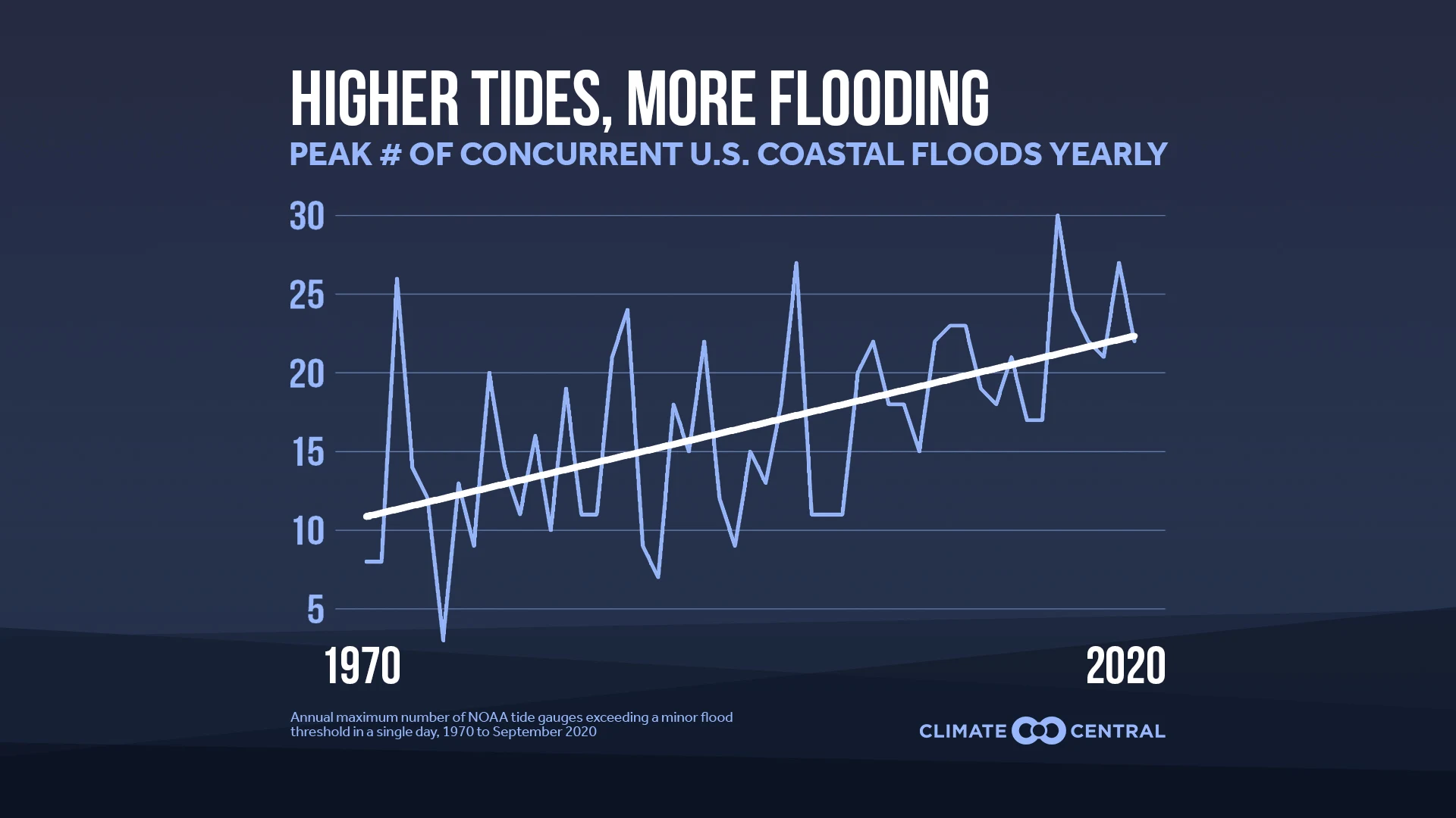 New analysis shows that coastal flooding is not only happening more often, it is striking more places at once. Analyzing hundreds of hourly tide gauge datasets from NOAA, the oldest of which dates back before 1950, Climate Central scientists found an increasing trend in the annual maximum number of tide gauges concurrently measuring flood-stage water levels. Further, the analysis found that September 22nd set a September monthly record for the number of concurrent coastal floods, with flood-stage water levels recorded at 84 currently active coastal tide gauges around the U.S.