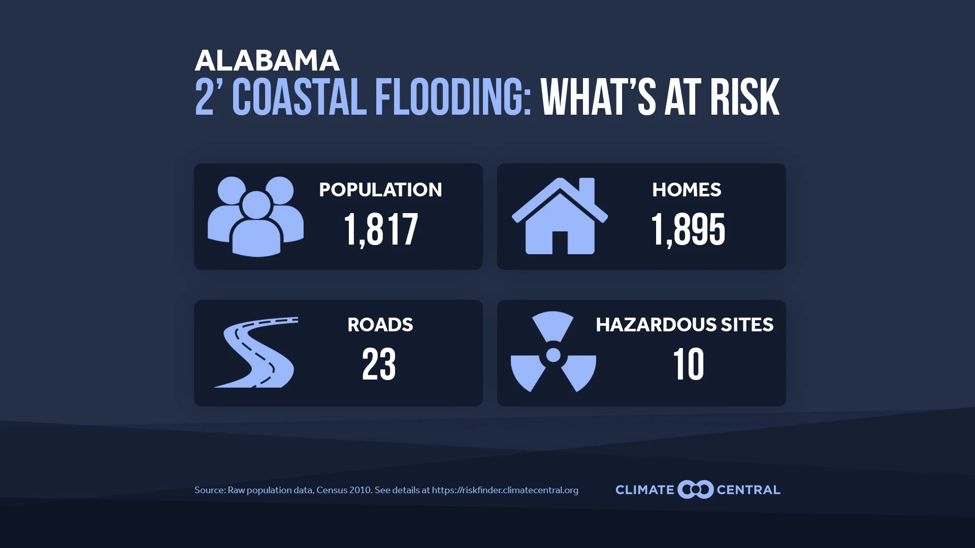 Click below for a CSV file containing data on the population, land, contamination risks, and infrastructure at risk from a 2-foot flood by state.