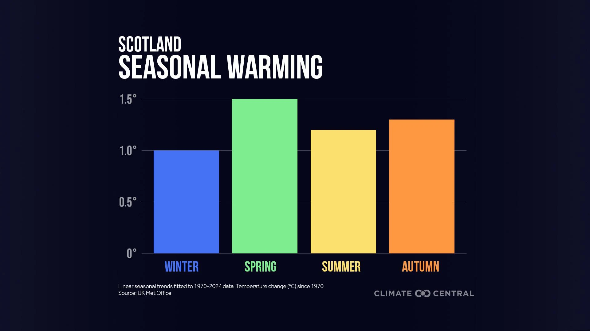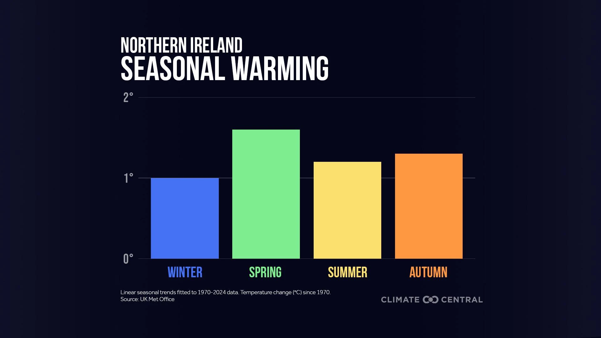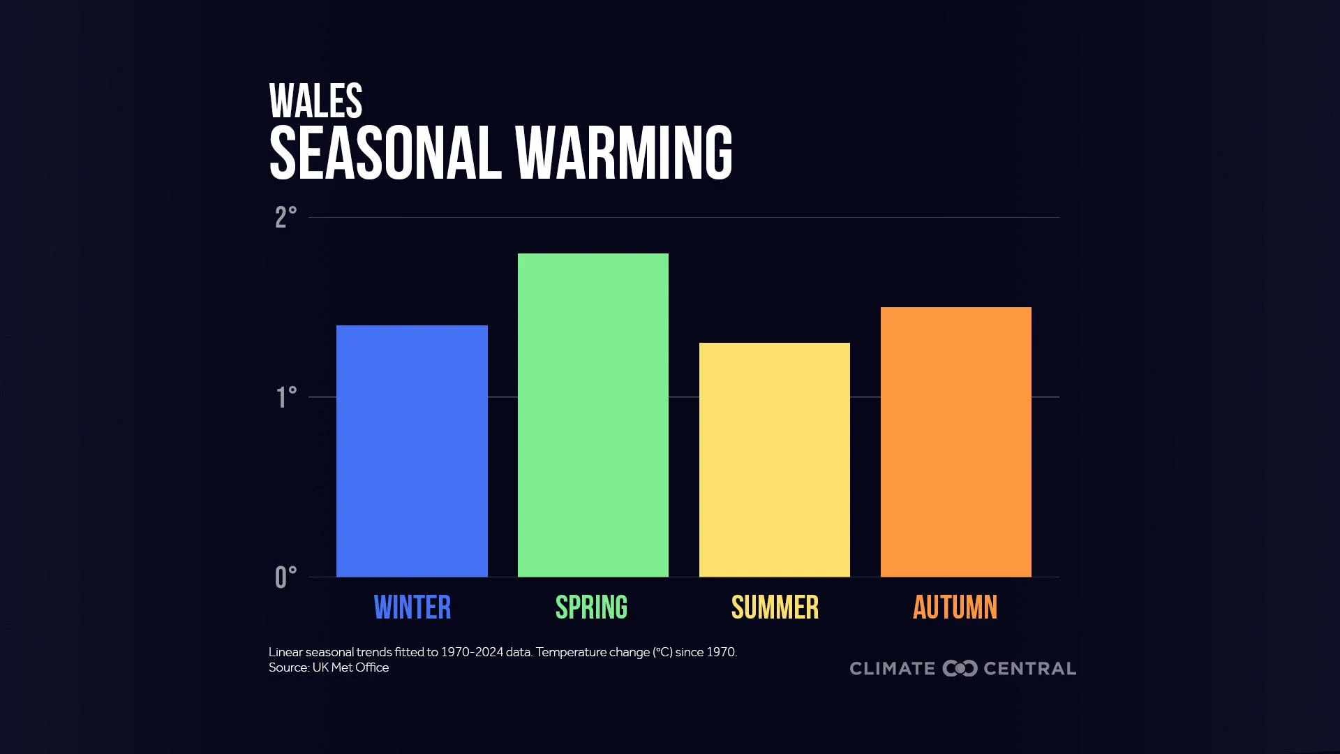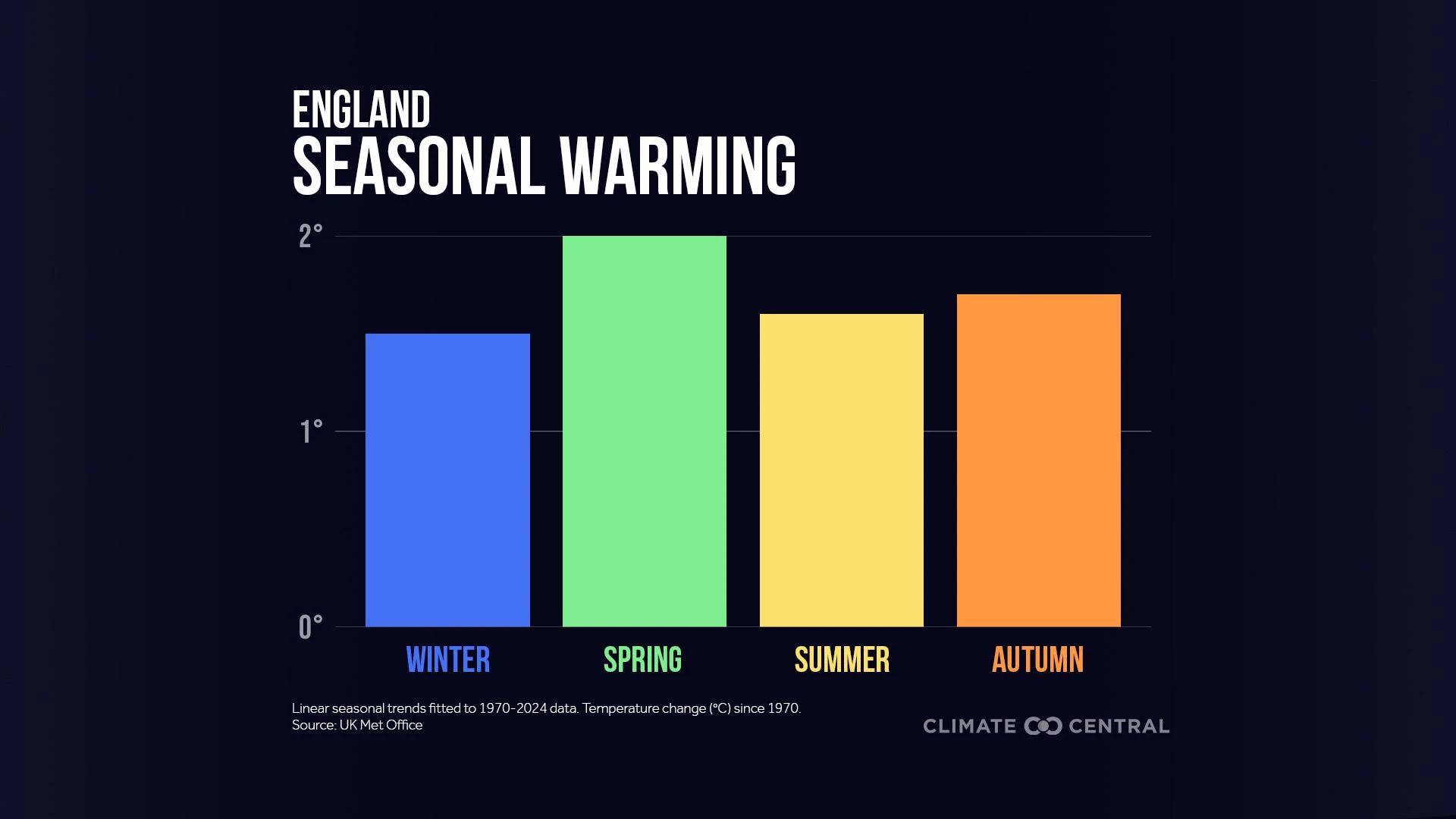 Using data obtained from the U.K. Met Office, Climate Central analyzed seasonal warming trends since 1970 across the U.K. to see how much warming they’ve experienced in each season — and how quickly.