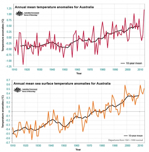 Graphs showing land (top) and ocean surface temperatures for Australia since 1910.