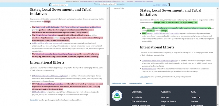 The changes were shared exclusively with Climate Central by EDGI, a group of scientists tracking federal websites and data. They first noticed the changes on Jan. 22 on a page formerly called “Federal Partner Collaboration,” but now dubbed “EPA Adaptation Collaboration.” Researchers spotted further changes on Jan. 26 to climate and water and international cooperation pages. All the pages are subpages of the EPA’s climate change page.