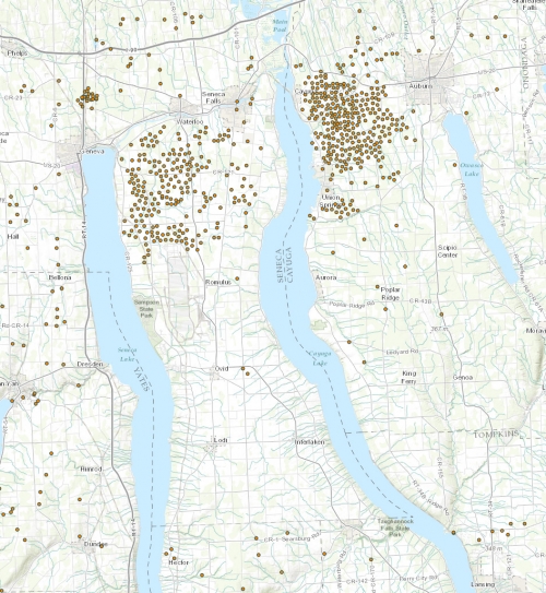 A moratorium currently bars fracking from ocurring in the state of New York, but FracTracker's map shows that New York has many oil and gas wells. Here, the map shows a high concentration of wells in the Finger Lakes region of New York near Auburn, Seneca Falls and Geneva.