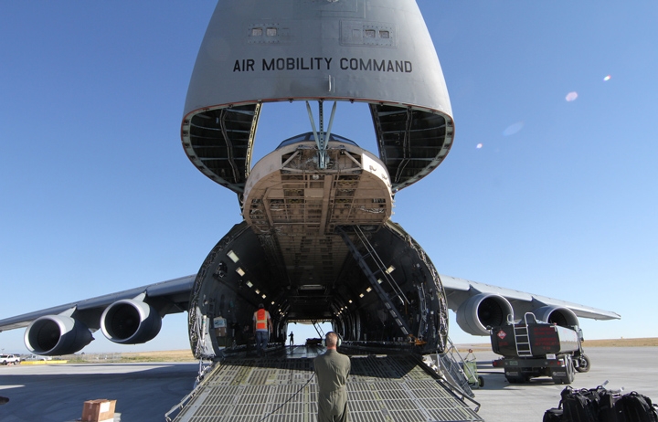 A U.S. Air Force C-5M Super Galaxy preparing to take GOES-R to the Kennedy Space Center for its scheduled launch next month.