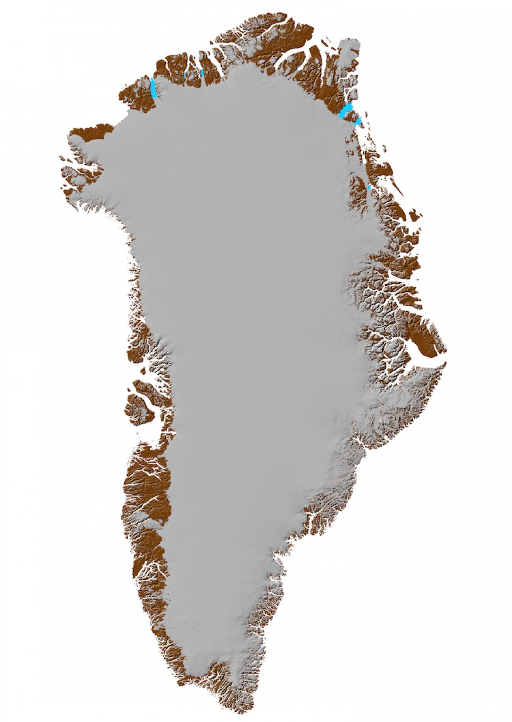 Bed topography revealed by the mass conservation method (blue is below sea level.