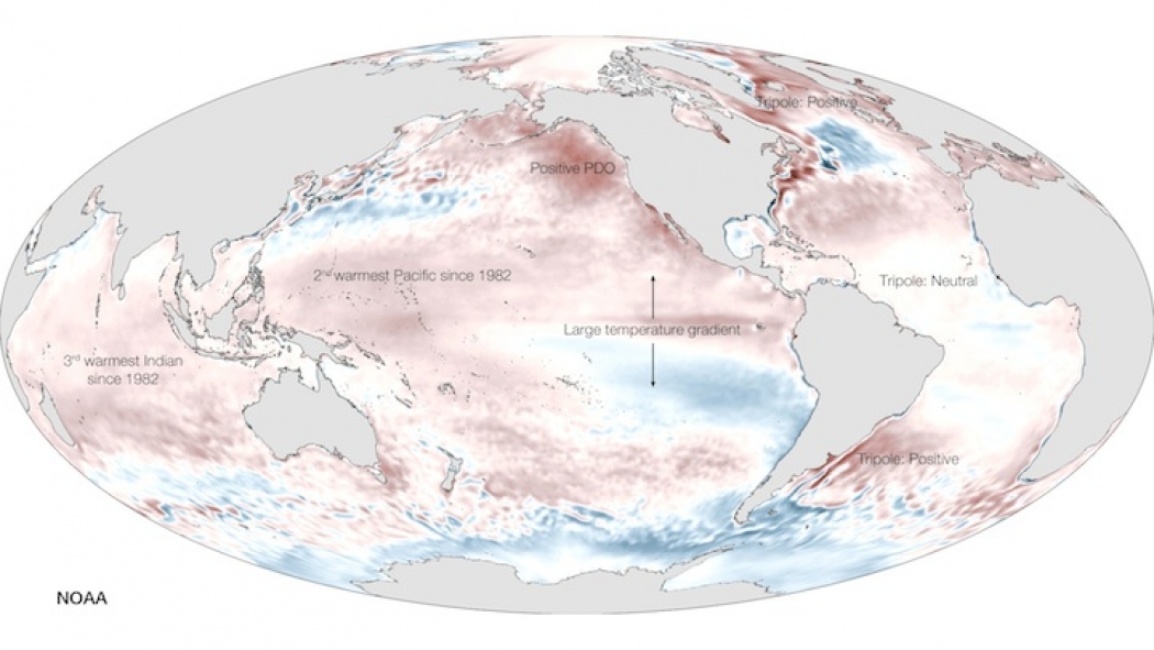 The 2014 mark was largely driven by considerable heat in the world’s oceans, as illustrated in the above graphic of sea surface temperatures released by NOAA. The map shows that parts of the Pacific were the second warmest on record and the Indian Ocean was the third hottest since 1982.