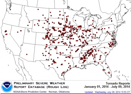 Preliminary tornado reports for the U.S. through July 9, 2014.