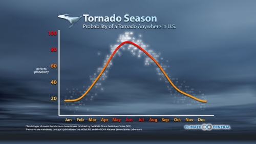 The probability of at least one tornado occurring somewhere in the U.S. on a given day, based on tornado reports since 1980. Click to enlarge. Credit: Climate Central